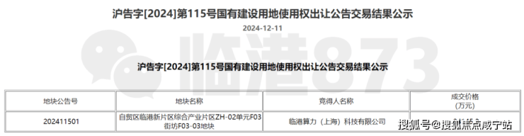 12月11日,官方发布公示,自贸区临港新片区综合产业片区ZH-02单元F03街坊F03-03地块成功出让。