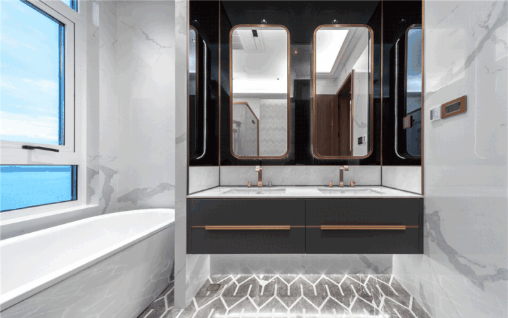 主卧室配置了独立衣帽间、独立卫生间和书房,主卫更是采用了双台盆+浴缸+淋浴,尽显奢华与高端。