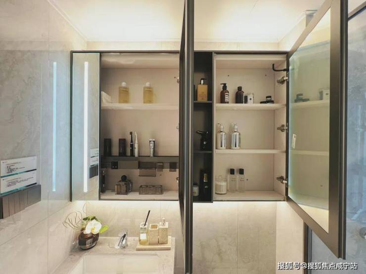 卫浴收纳空间也非常极致,大面积的卫生间镜柜,分为储藏柜和开放格两部分,满足不同收纳需求,马桶侧边开放式置物空间很人性化,细节方面也很出彩。