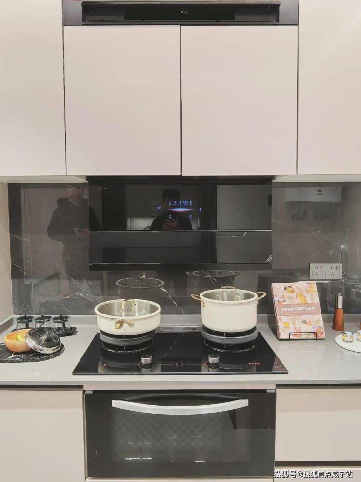 厨房里更能展现中建东孚的诚意,标配方太高端系统厨电,其中油烟机自带制冷功能,除油烟开启的同时联动空调出风,产品细节更加人性化。