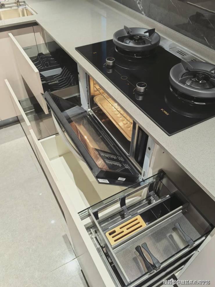 打开厨房柜体后,会发现收纳空间别有洞天,锅碗篮、调味拉篮都是交付标准,柜体分割也更加合理。