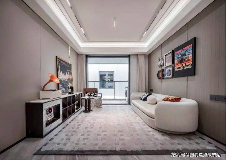 客厅约3.4m面宽,地面都是一体通铺的90*180大面砖,简洁清爽。