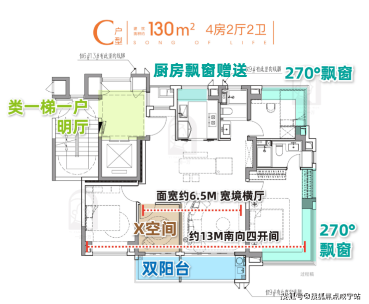 3.建面约 130㎡4房2卫:四开间朝南+可变横厅+双阳台联动,一步到位的改善标杆