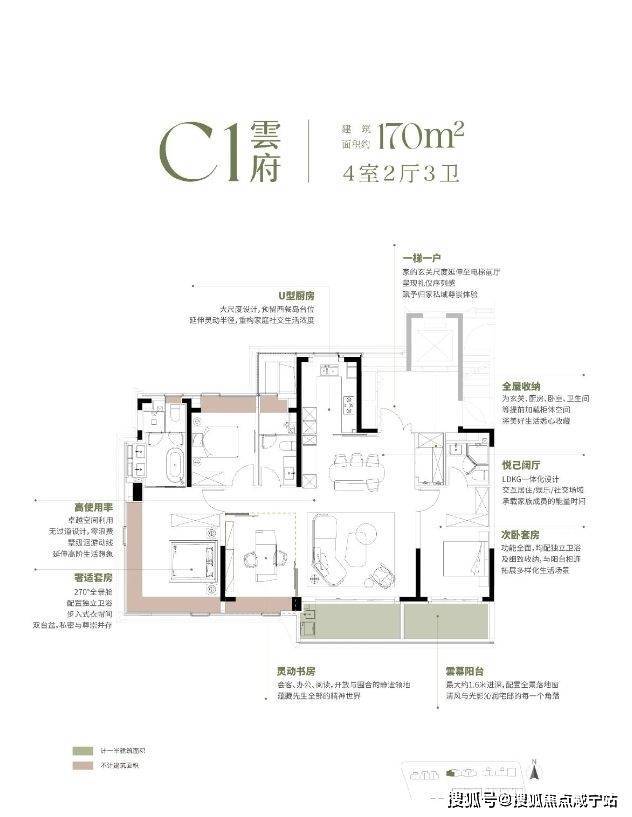 建面170㎡“悬浮全景舱”户型:——南向15.8米四面宽让每个空间都享阳光平权,深U型厨房预留西厨岛台,约8.35米双阳台兼顾功能与情绪价值,双套房+270°全景窗+三卫设计,更将“新平权主义”落到实处,让每个家庭成员都有私密空间;