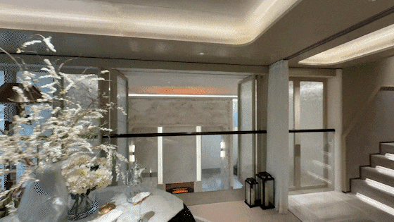 搭配入户景观与落地窗自然渗透设计,翡雲悦府·悦墅II期打造了一个以LDKB无界宽厅为核心的流动五联厅,彻底打破“客厅-餐厅-厨房-庭院-卧室”的传统割裂。