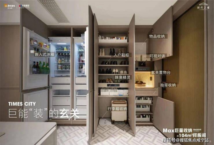 参考过往样板间,项目进门右手是一整盘玄关柜,含S墙在内的通顶柜体,可以收纳各类生活物品,鞋子、行李箱、杂物等做了很多分区。其中玄关置物台还是带奢石的,点缀其中。