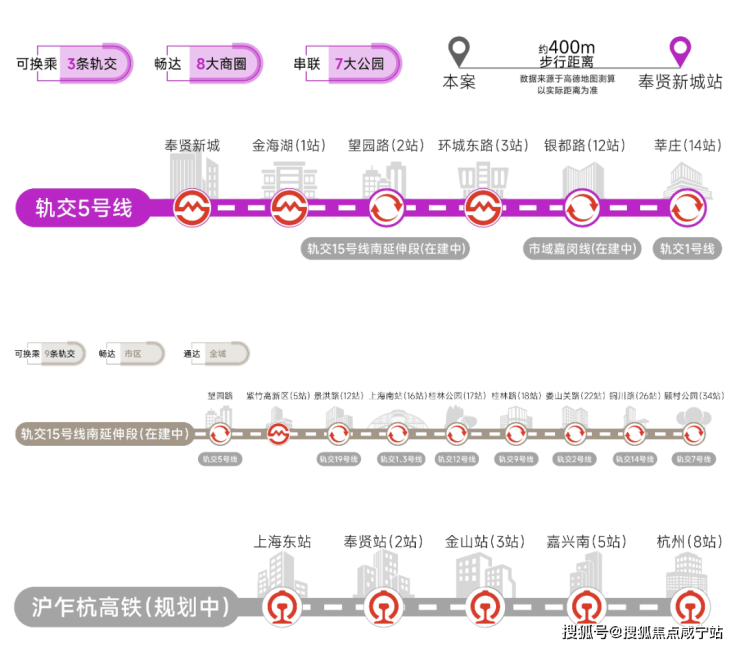 轨交网络:5号线、15号线南延伸段(在建中)、市域嘉闵线南延伸段(规划中)、沪乍杭高铁(规划中)及南枫线(在建中)