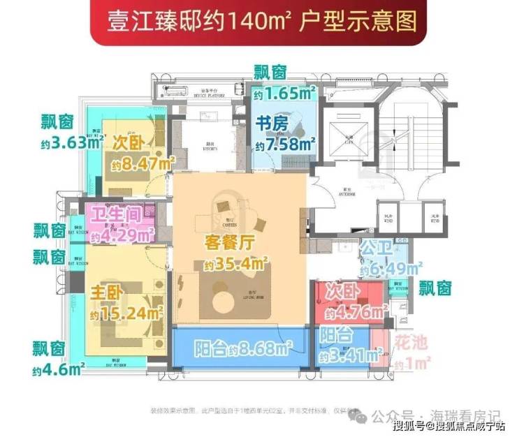 建面约140㎡户型则通过6个飘窗(含2个270°转角飘窗)、2个南向阳台(赠送一半面积)及独享约6.8㎡电梯厅,赠送面积高达约27.2㎡。