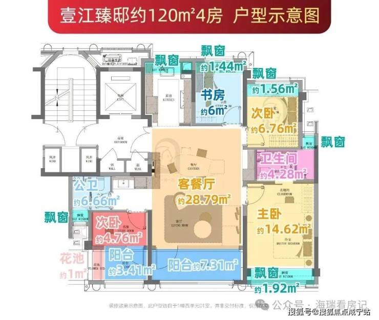 建面约120㎡户型通过6个飘窗、2个南向阳台(赠送一半面积)及独享约5㎡电梯厅,整体赠送面积约18.5㎡;