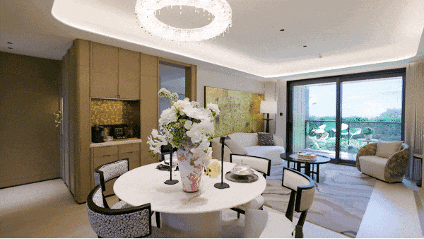 园林方面,通过1700㎡口袋公园串联城市绿地,内部打造3900㎡隐奢园林,斯卡帕大师灵感垂直造景,实现“内外三公园”。