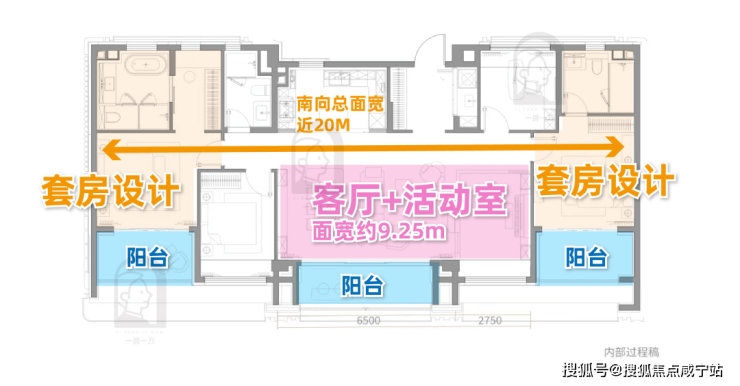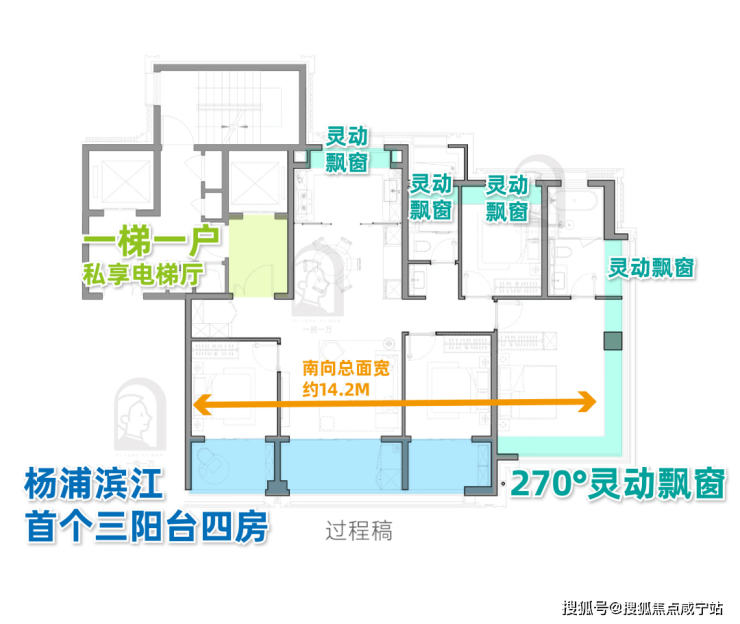 四面宽朝南布局,南向总面宽约达14.2米,搭配三阳台设计,最大化引光入室。