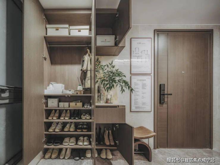 在后期合理利用下,可以增加多样功能,把家的玄关尺度,自然延伸到这个前厅,在家门口单独摆放一个进深约30cm、顶天立地的收纳柜,回家换下的鞋子、雨具、宠物用的牵引绳……都在家门口提前收纳整理。