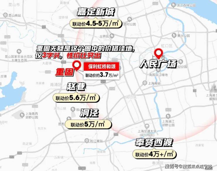 打开地图,若以市中心为圆心,赵巷与重固离市中心距离相当,联动价已达5.6万/㎡,嘉定新城4.5-5万/㎡,奉贤西渡也已4万+/㎡。