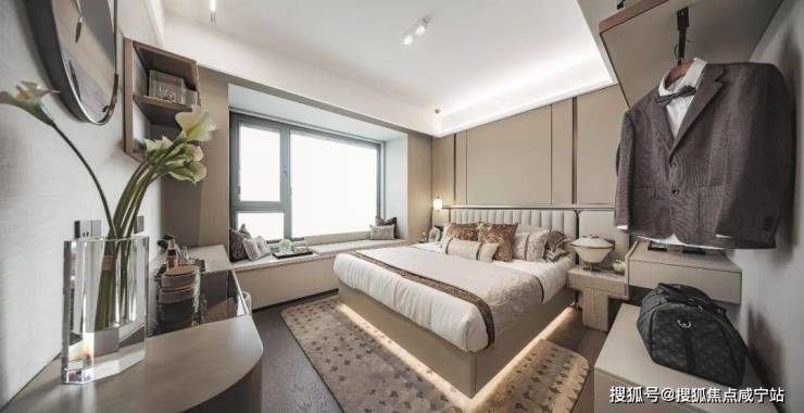 而保利虹桥和颂主卧南向增加了半米的开间,这样就能在床尾设计一个梳妆台或者书桌,让主卧具备更强的功能性,实现真正的小家化。