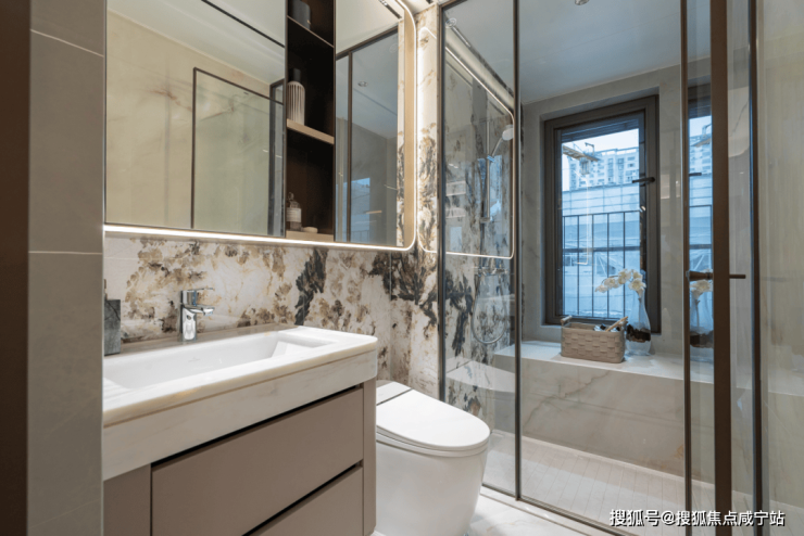 值得一提,保利戳中女性需求,主卫新增科勒美妆龙头,水流角度贴合化妆、护肤需求;主卫镜柜嵌入美妆冰箱,贴心存储口红、面膜等护肤品。