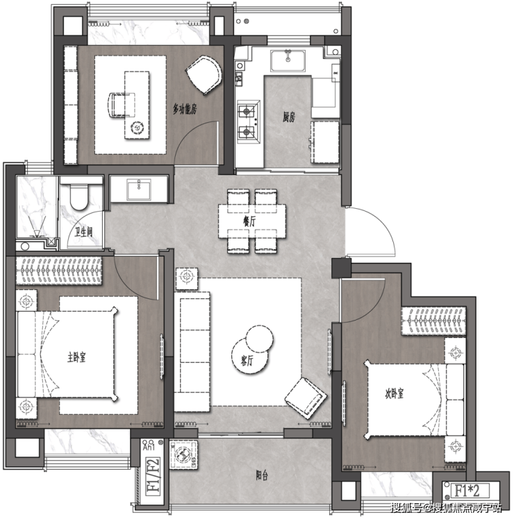 建面约100㎡高层产品,面宽约5米的大横厅一体式布局,尺度感上佳。