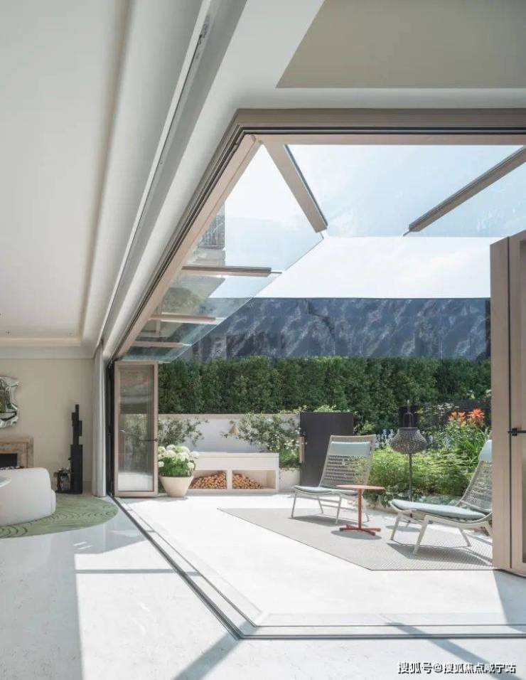 「无界空间」:客厅270度转角无柱设计,搭配落地玻璃,开阔视野将院中风景迎入日常。