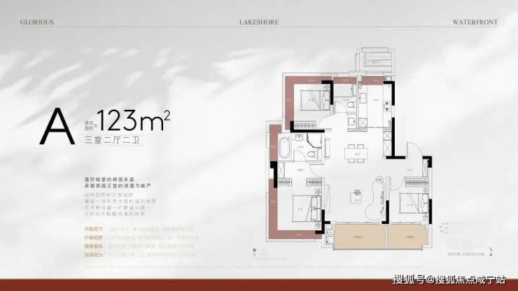 户型三开间朝南,客厅面宽约4.5米,边套主卧和北卧均为270°转角飘窗。