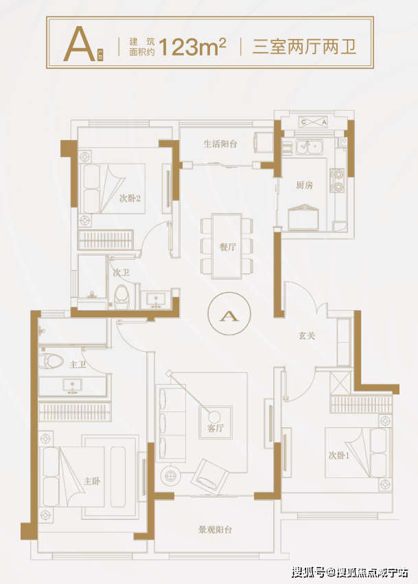 ▶ 约123㎡三房:南向面宽超10米,餐客阳台一体化;