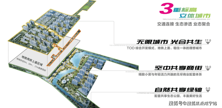 二度 标高10m:配有生活服务配套,商业、公园、办公。1万㎡精致生活配套 、 盖上商业文化、体育文化、养老医疗、行政管理健康四轴。
