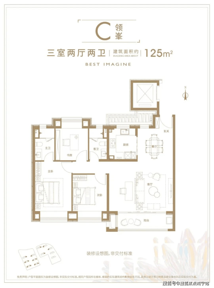 建面125㎡,套内约100㎡,得房率80%,四房两厅两卫,南北双阳台,进深9.9 m,形成“超薄”户型。