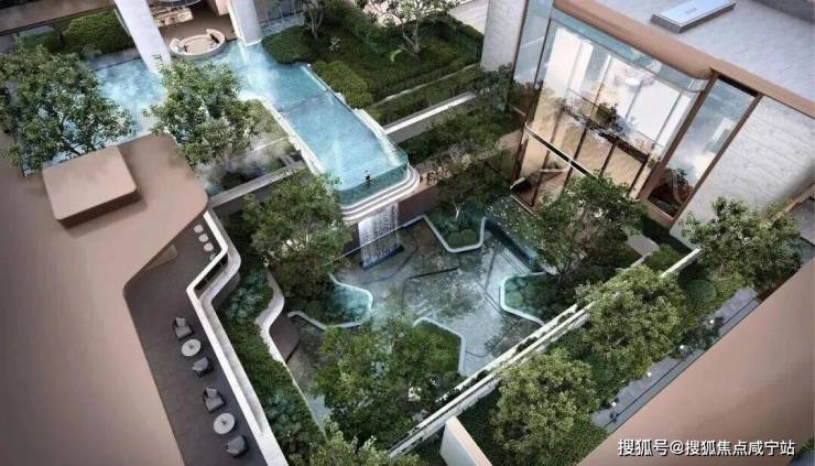 “漂浮的绿洲”,九重层次下沉庭院,区域悬浮泳池+4.3米飞瀑设计,塑造极致度假感受,丰富的视觉奇观。