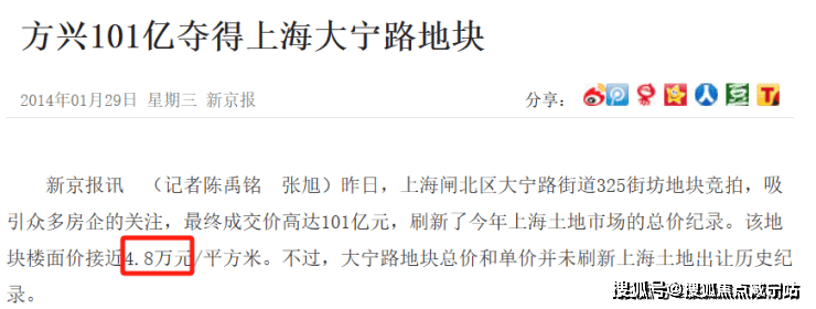 2014年1月土拍,上海闸北大宁地块出让,最终被金茂拿下,楼板价接近4.8万一平,甚至超越了周边的二手房价。