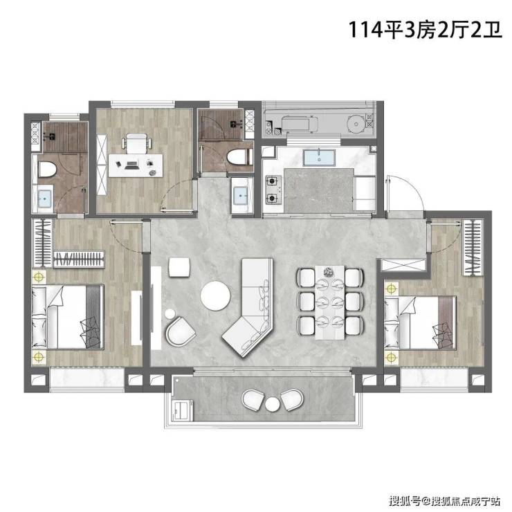 该户型做到了三开间朝南+超大面宽横厅+主卧套房设计+卫生间干湿分离+南北通透,功能性和尺度感完美结合。