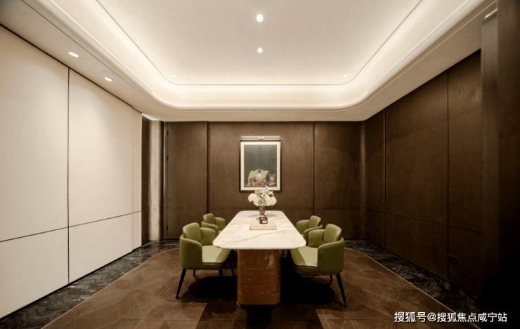 室内墙面大面积铺设温润质感的木饰面,墙面转角处采用曲面处理,为空间注入温馨舒适的居住氛围。