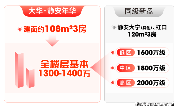静安大宁、虹口新盘,3房总价约1600万起,若想买中区房源,要到1800万级;而大华·静安年华108㎡3房,全楼层总价基本1300多万,门槛温柔太多。
