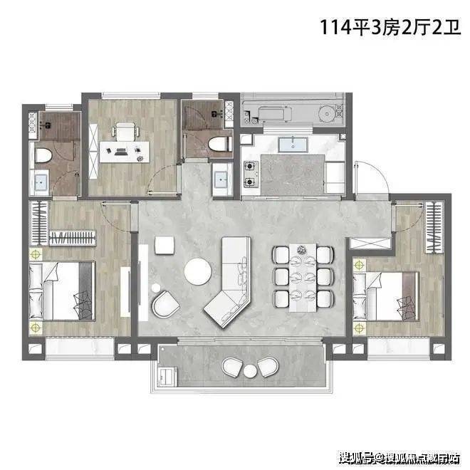 建面约114㎡3房2厅2卫户型▼
