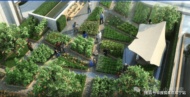 屋顶菜园:城市田园梦,人与自然的乌托邦(此处指配套用房屋顶)。一块小菜地,可以唤起人们对土地和自然的亲近感,也能让一家人在照料蔬果的时光里,创造美好、独特的共同回忆。