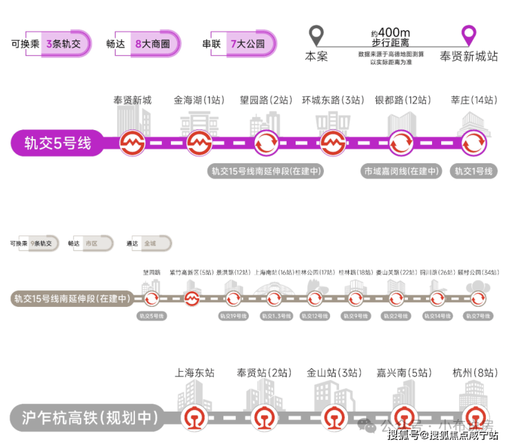 交通方面:项目多轨交环绕,5号线、15号线南延伸段(在建中)、市域嘉闵线南延伸段(规划中)、沪乍杭高铁(规划中)及南枫线(在建中)