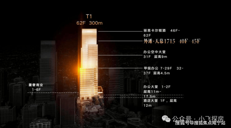 在这片建筑群中,总高达300米的T1是最引人瞩目的存在。底部1-6层为重奢商业,中部7-37层为甲级办公,中高区40-45层为行政公馆外滩·天幕1715,上部46-62层为丽思卡尔顿酒店,与浦东陆家嘴丽思卡尔顿酒店遥相呼应。