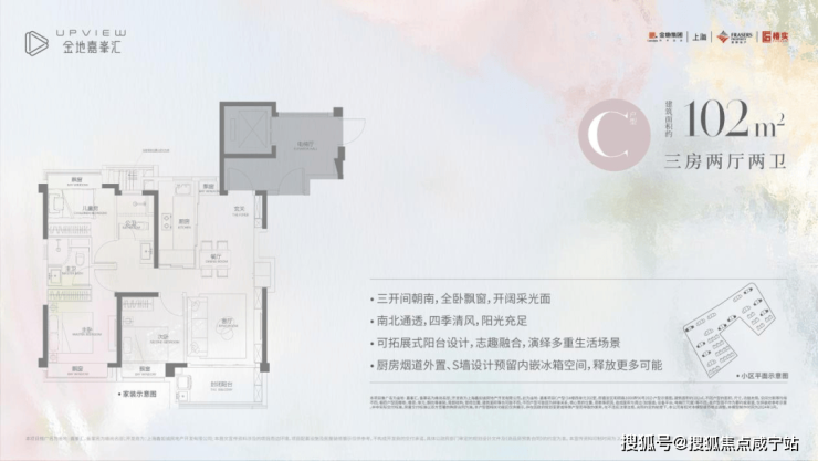 A 户型为建面约10 2㎡3房2厅2卫,该户型大方厅,三开间朝南,厨房烟道外置,预留冰箱S墙设计,南向次卧与客厅可灵活打通。