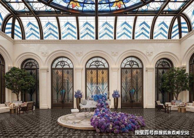 「华亭烟雨」造设波光喷泉与孔雀雕塑,八株紫玉兰盛绽其间,将自然之力凝聚为艺术语言;「千步廊」汲取和平饭店的设计灵感,地面通铺同款“金珠算盘”,并融入绒绣、顾绣、海派玉雕等“上海非遗十绝”,将海派东方的摩登风韵尽致演绎;「孔雀厅」同源上海华尔道夫酒店精髓,约14米挑高宏阔大堂,开阔奢华,穹顶巨幕彩绘玻璃,历经团队三轮打样,终成绮丽之景.