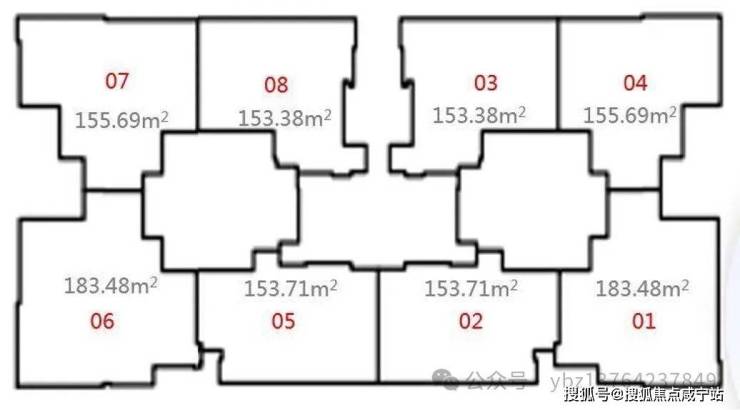 该栋分为A/B单元,每个单元有四个单位:包含3套150㎡及1套180㎡,平面布局与住宅相似