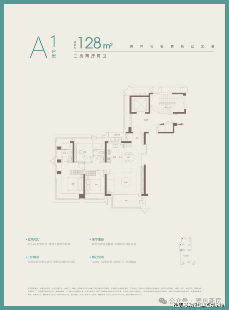 建面约128㎡的户型来看:整个户型拥有约270°的超级采光面,客厅有宽面阳台、双次卧+次卫有飘窗、主卧有约270°的无柱转角飘窗+双飘窗的主卫,整个空间采光通透度相当出众。最重要的是,这6飘窗+1个约270°的无柱飘窗全是赠送空间!