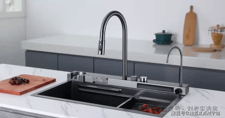 其中,网红多功能水槽设置有钢琴式按键、精准控温、直饮龙头、洗杯器、瀑布出水、一键排水等功能。