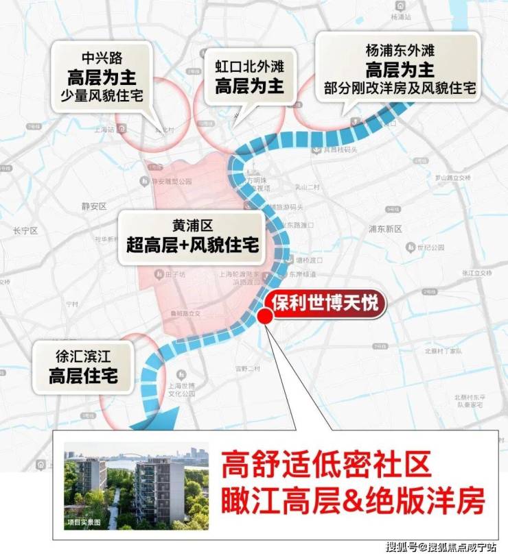 保利·世博天悦,站位世博滨江板块核心,与黄浦江边直线距离仅约80米,地段价值不言而喻。