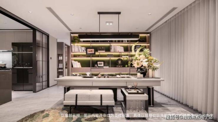 细节上,餐厅飘窗上的柜子是交付的;岛台靠餐客厅一侧也做了开放式的收纳,配了升降插座;