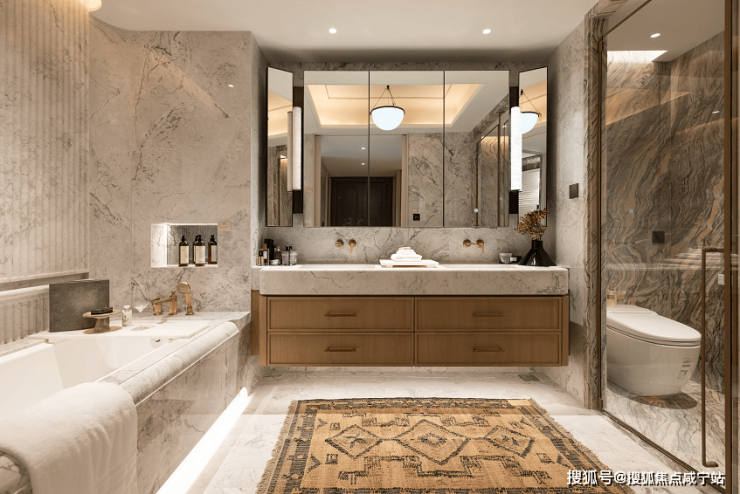 正对玄关的位置是主卫, 地面墙面为巴西鱼肚灰,淋浴间为水云纱。 五金品牌为GESSI,浴缸及智能马桶品牌为劳芬,定制镜柜里面配有美妆冰箱。