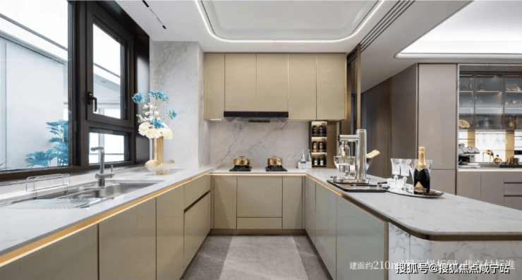 同时,本案还有堪称震撼的约100㎡社交巨厅,玄关、客餐厅、厨房与阳台一体化设计,约3.2米的标准层层高,这整个客厅呈现出的体感远超210㎡,更像250-260㎡的尺度!