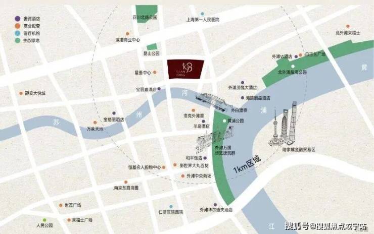 再看项目的位置,选址于黄浦江与苏州河交汇处,距离上海著名的外白渡桥仅约260米,家门巷口的这道湾就是黄浦江精华之所在,从这里可以直接步行至外滩。这里是上海市中心真正核心的优质地段!