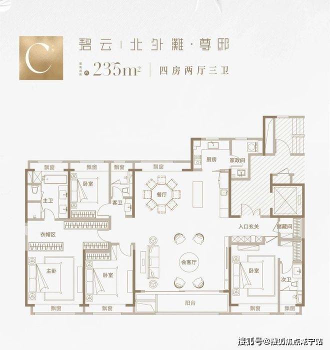 建面约235㎡4房2厅3卫:约7米超大横厅,三卧室朝南,LDKB一体格局,约60平社交会客厅,全屋飘窗通透采光、大尺度景观阳台,超30平至尊套房主卧、双南套房、全明三卫设计、高规格精装标准。