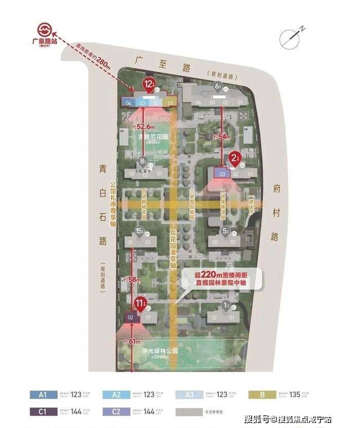 中央纵向景观轴约250m,横向景观轴约140m,楼栋横向距离达约50m!