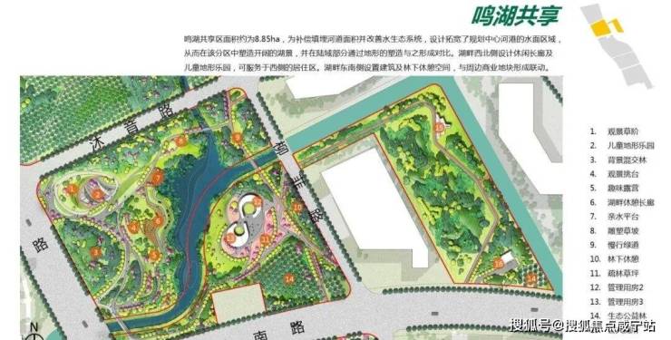 整座公园(在建中)划分为:湿地花园区、鸣湖共享区、林荫跃动区和社邻园艺区,四大功能分区。