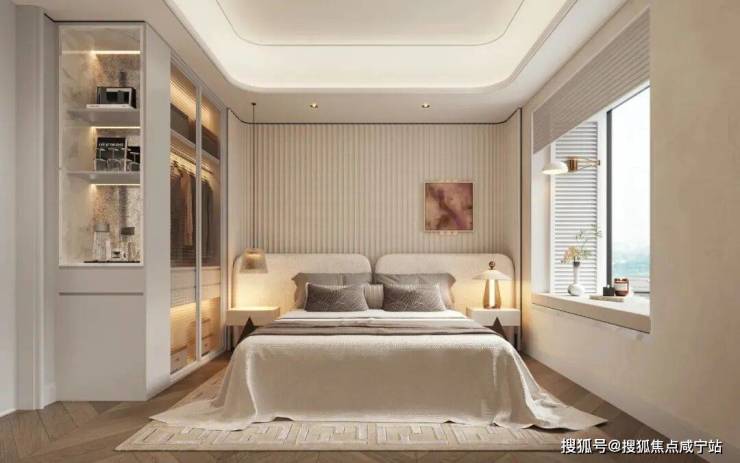主卧迷你吧山水白大理石包边、背景墙采用奶白色弧形皮革硬包、飘窗法式百叶格栅屏风造型细节拿捏;次卧作为兴趣空间使用,居住幸福感满满