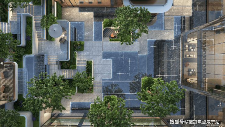项目以外滩精奢酒店&江湾蓝绿臻境为灵感,打造 三重台地悬瀑自然庭院!