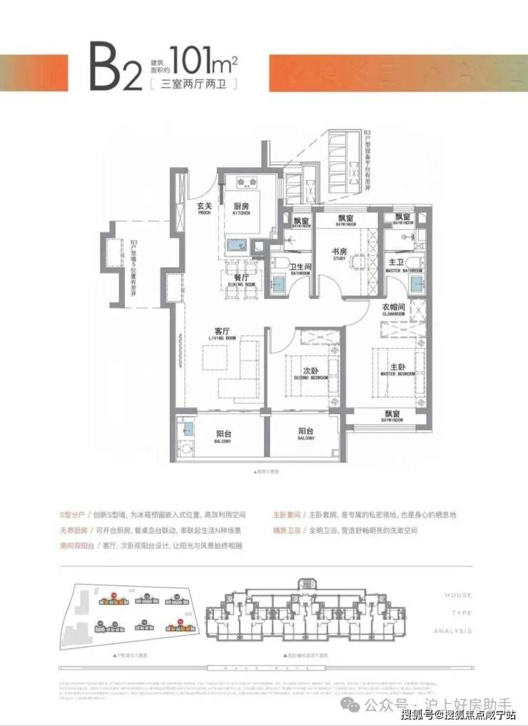 建面约89㎡3房户型:东边套主卧配置约270°双向采光飘窗、S墙设计,主力总价仅约450万级,首付约90万起!